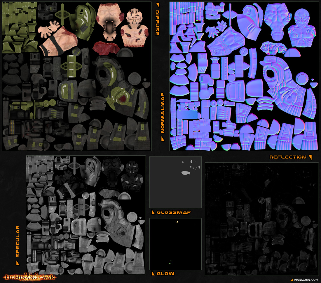 2048x2048 Normal, Diffuse, Specular, Reflection, Glow & Gloss maps.